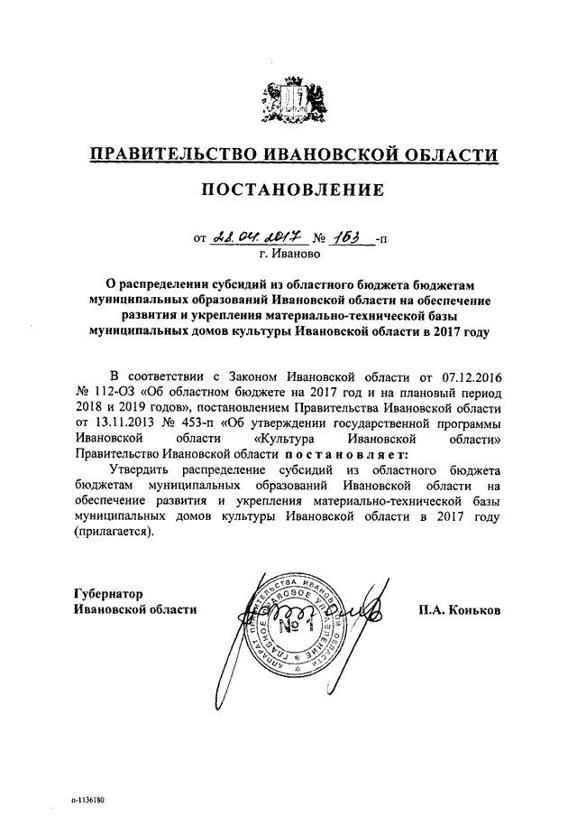 Постановление Правительства Ивановской области от 28.04.2017 N 163-п "О распределении субсидий из областного бюджета бюджетам муниципальных образований Ивановской области на обеспечение развития и укрепления материально-технической базы муниципальных домов культуры Ивановской области в 2017 году"