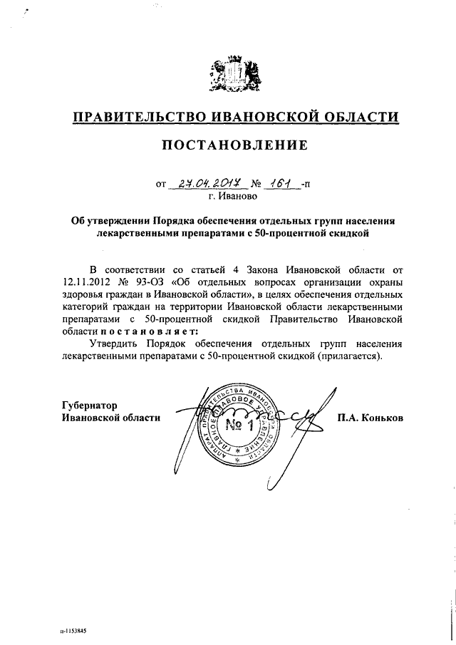 Постановление Правительства Ивановской области от 27.04.2017 N 161-п "Об утверждении Порядка обеспечения отдельных групп населения лекарственными препаратами с 50-процентной скидкой"