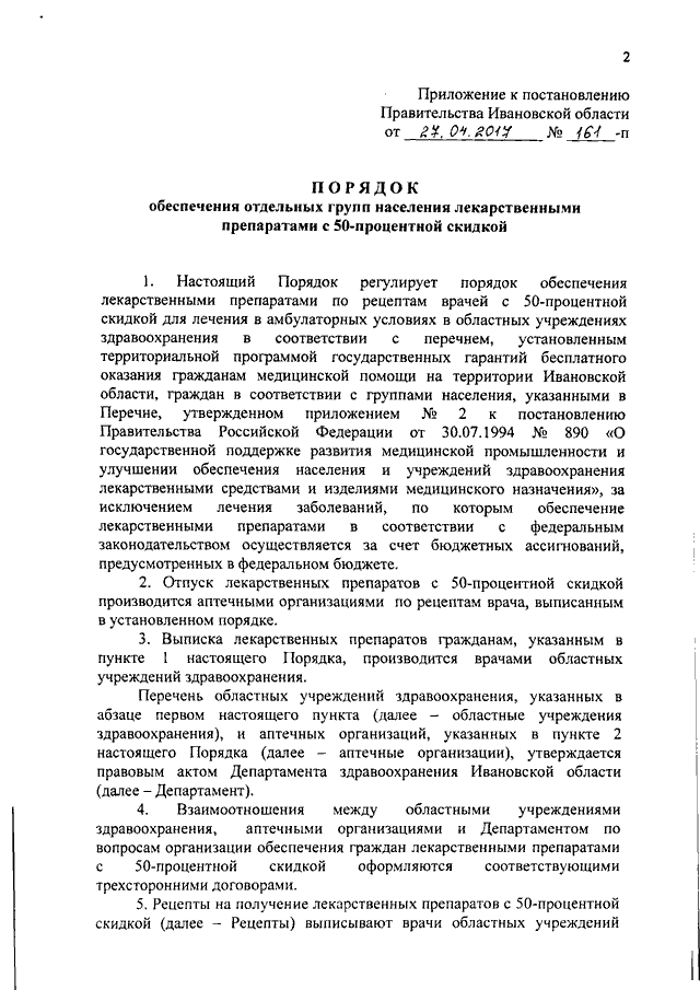 Постановление Правительства Ивановской области от 27.04.2017 N 161-п "Об утверждении Порядка обеспечения отдельных групп населения лекарственными препаратами с 50-процентной скидкой"