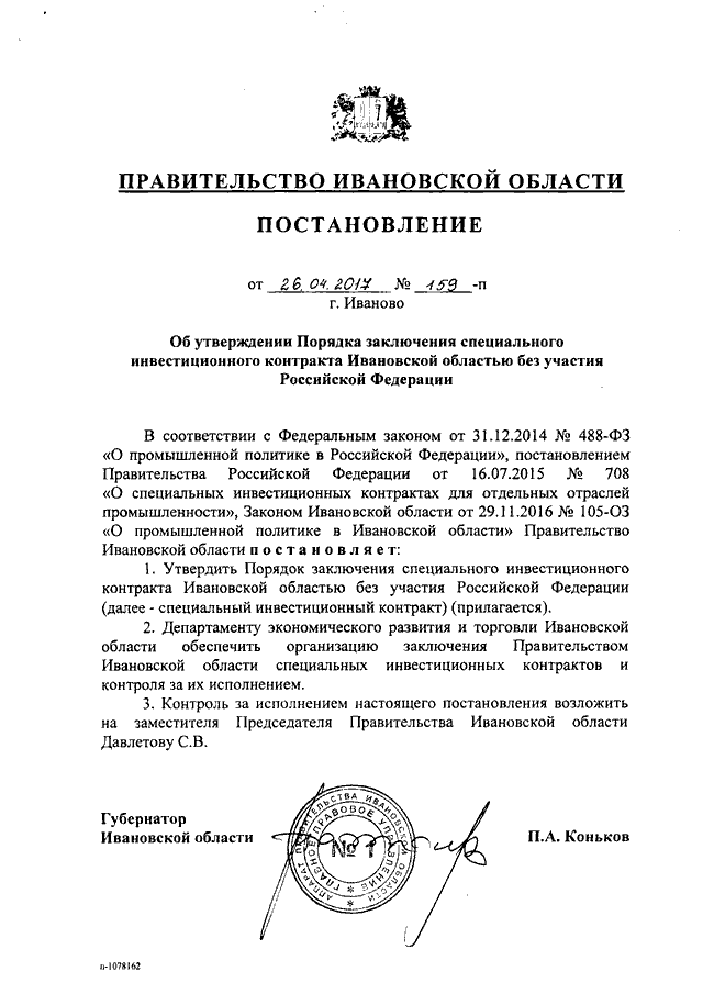 Постановление Правительства Ивановской области от 26.04.2017 N 159-п "Об утверждении Порядка заключения специального инвестиционного контракта Ивановской областью без участия Российской Федерации"