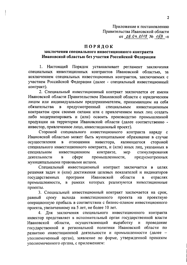 Постановление Правительства Ивановской области от 26.04.2017 N 159-п "Об утверждении Порядка заключения специального инвестиционного контракта Ивановской областью без участия Российской Федерации"