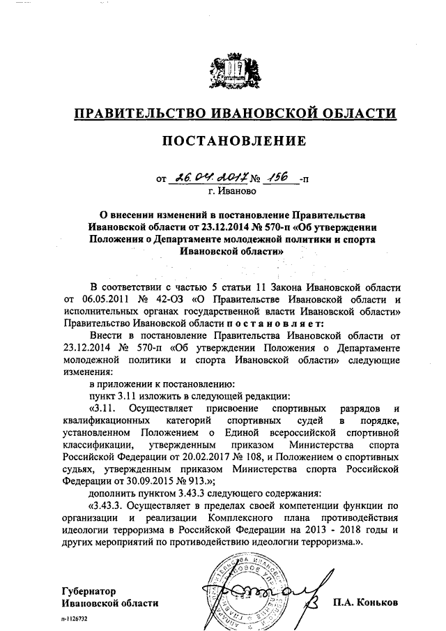 Постановление Правительства Ивановской области от 26.04.2017 N 156-п "О внесении изменений в постановление Правительства Ивановской области от 23.12.2014 N 570-п "Об утверждении Положения о Департаменте молодежной политики и спорта Ивановской области"