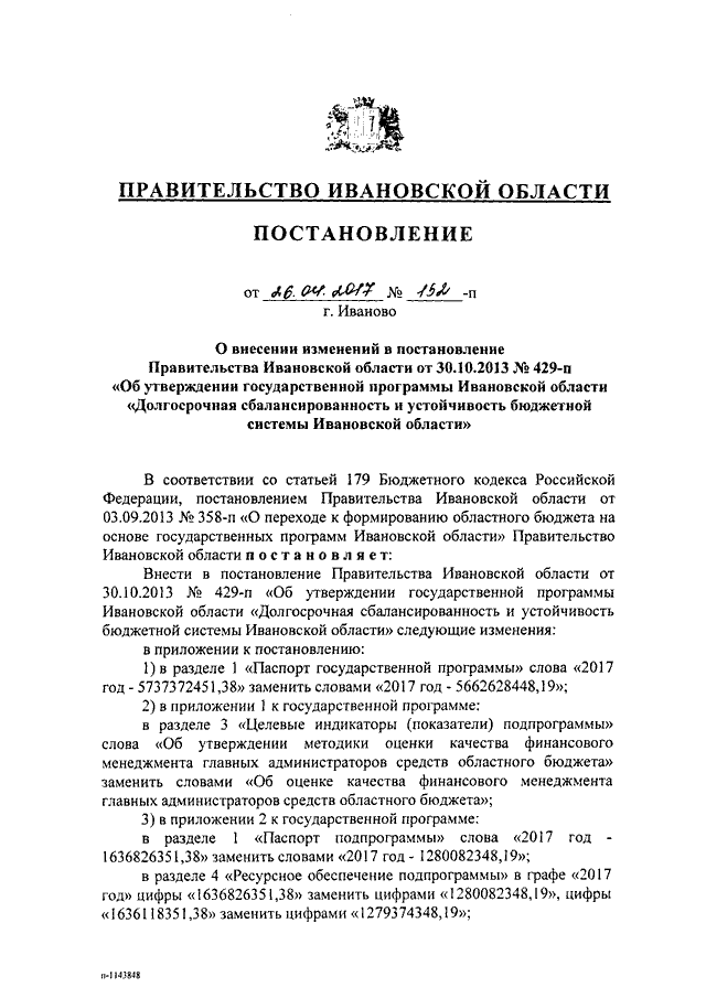Постановление Правительства Ивановской области от 26.04.2017 N 152-п "О внесении изменений в постановление Правительства Ивановской области от 30.10.2013 N 429-п "Об утверждении государственной программы Ивановской области "Долгосрочная сбалансированность и устойчивость бюджетной системы Ивановской области"