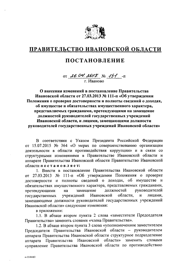 Постановление Правительства Ивановской области от 26.04.2017 N 151-п "О внесении изменений в постановление Правительства Ивановской области от 27.03.2013 N 111-п "Об утверждении Положения о проверке достоверности и полноты сведений о доходах, об имуществе и обязательствах имущественного характера, представляемых гражданами, претендующими на замещение должностей руководителей государственных учреждений Ивановской области, и лицами, замещающими должности руководителей государственных учреждений Ивановской области"