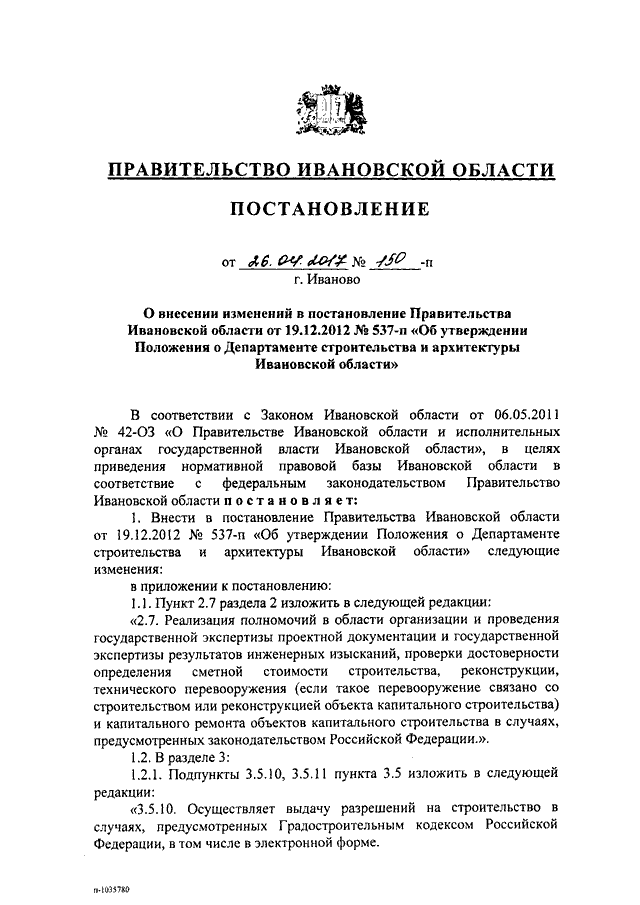 Постановление Правительства Ивановской области от 26.04.2017 N 150-п "О внесении изменений в постановление Правительства Ивановской области от 19.12.2012 N 537-п "Об утверждении Положения о Департаменте строительства и архитектуры Ивановской области"