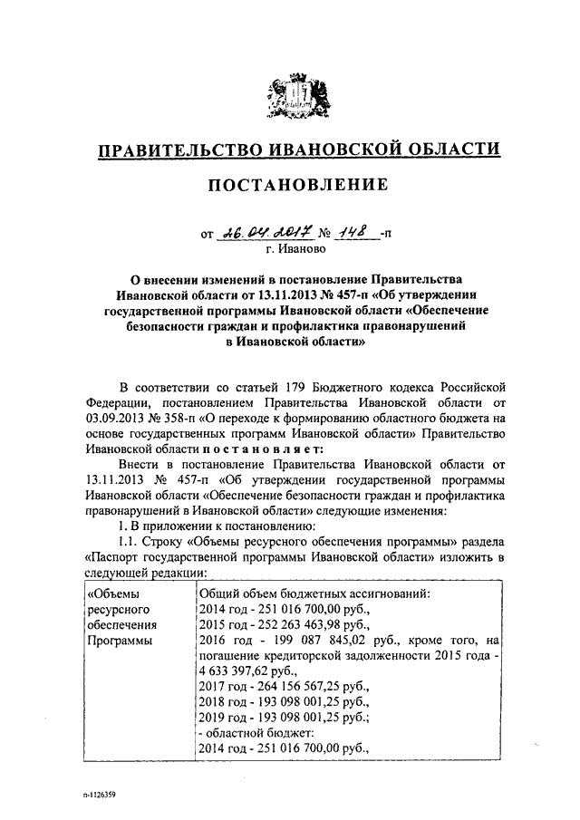 Постановление Правительства Ивановской области от 26.04.2017 N 148-п "О внесении изменений в постановление Правительства Ивановской области от 13.11.2013 N 457-п "Об утверждении государственной программы Ивановской области "Обеспечение безопасности граждан и профилактика правонарушений в Ивановской области"