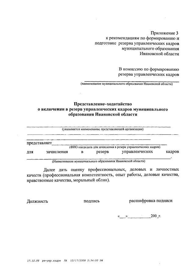 Распоряжение Правительства Ивановской области от 24.12.2008 N 485-рп "Об утверждении рекомендаций по формированию и подготовке резерва управленческих кадров муниципального образования Ивановской области"