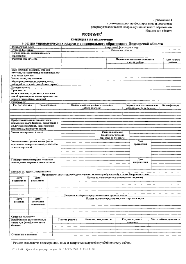Распоряжение Правительства Ивановской области от 24.12.2008 N 485-рп "Об утверждении рекомендаций по формированию и подготовке резерва управленческих кадров муниципального образования Ивановской области"
