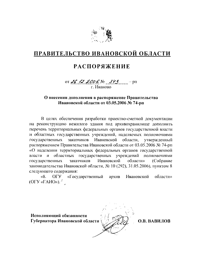 Распоряжение Правительства Ивановской области от 26.12.2006 N 343-рп "О внесении дополнения в распоряжение Правительства Ивановской области от 03.05.2006 N 74-рп"