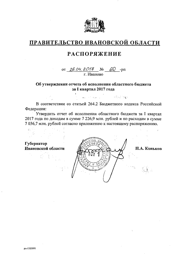 Распоряжение Правительства Ивановской области от 26.04.2017 N 60-рп "Об утверждении отчета об исполнении областного бюджета за I квартал 2017 года"