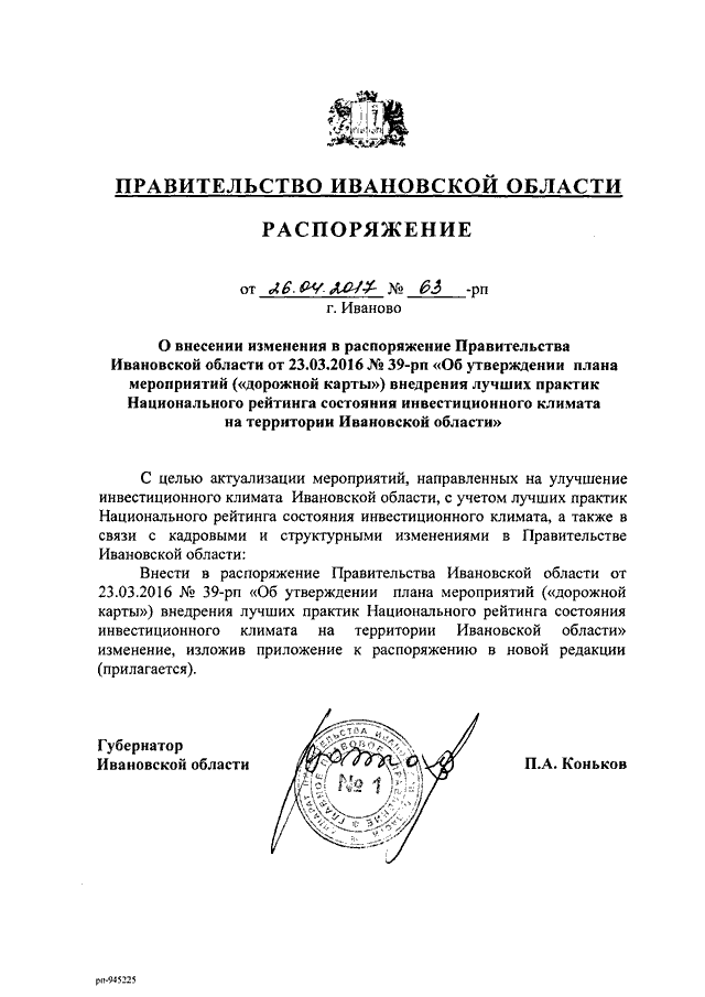 Распоряжение Правительства Ивановской области от 26.04.2017 N 63-рп "О внесении изменения в распоряжение Правительства Ивановской области от 23.03.2016 N 39-рп "Об утверждении плана мероприятий ("дорожной карты") внедрения лучших практик Национального рейтинга состояния инвестиционного климата на территории Ивановской области"