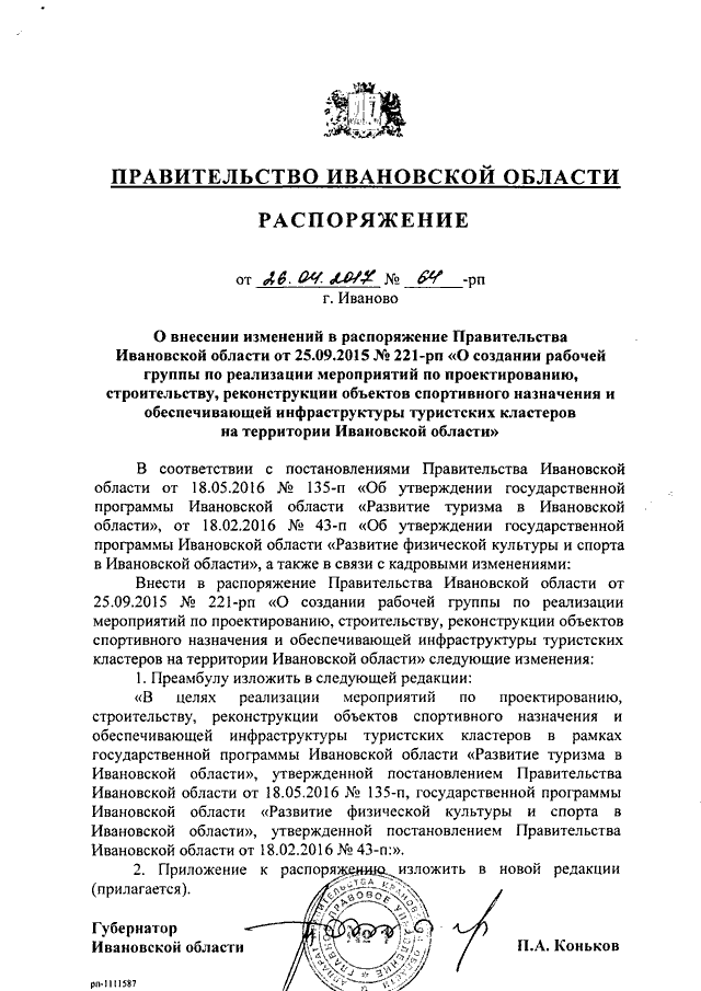Распоряжение Правительства Ивановской области от 26.04.2017 N 64-рп "О внесении изменений в распоряжение Правительства Ивановской области от 25.09.2015 N 221-рп "О создании рабочей группы по реализации мероприятий по проектированию, строительству, реконструкции объектов спортивного назначения и обеспечивающей инфраструктуры туристских кластеров на территории Ивановской области"