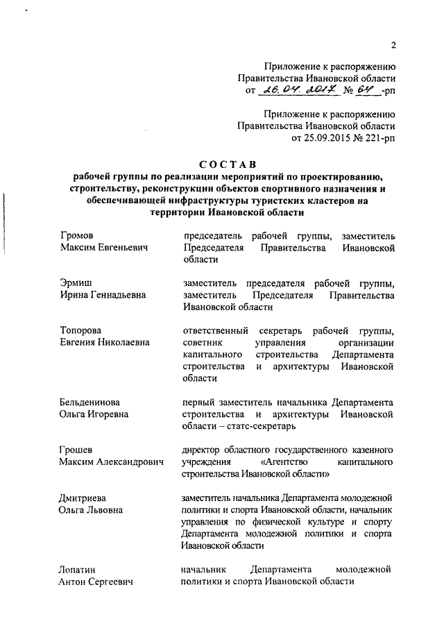 Распоряжение Правительства Ивановской области от 26.04.2017 N 64-рп "О внесении изменений в распоряжение Правительства Ивановской области от 25.09.2015 N 221-рп "О создании рабочей группы по реализации мероприятий по проектированию, строительству, реконструкции объектов спортивного назначения и обеспечивающей инфраструктуры туристских кластеров на территории Ивановской области"