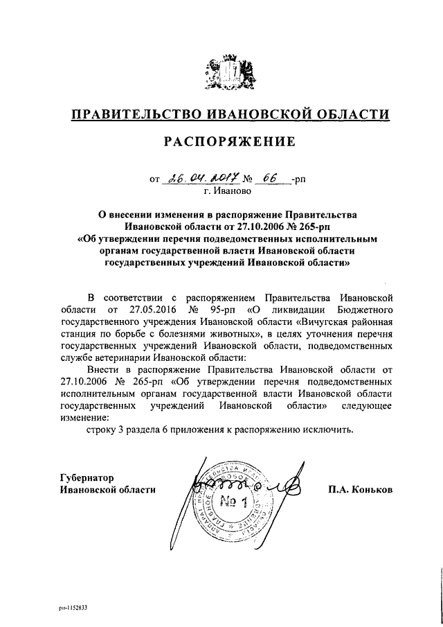 Распоряжение Правительства Ивановской области от 26.04.2017 N 66-рп "О внесении изменения в распоряжение Правительства Ивановской области от 27.10.2006 N 265-рп "Об утверждении перечня подведомственных исполнительным органам государственной власти Ивановской области государственных учреждений Ивановской области"