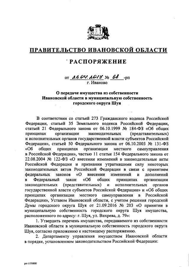 Распоряжение Правительства Ивановской области от 26.04.2017 N 68-рп "О передаче имущества из собственности Ивановской области в муниципальную собственность городского округа Шуя"