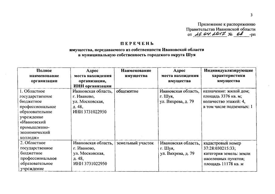 Распоряжение Правительства Ивановской области от 26.04.2017 N 68-рп "О передаче имущества из собственности Ивановской области в муниципальную собственность городского округа Шуя"