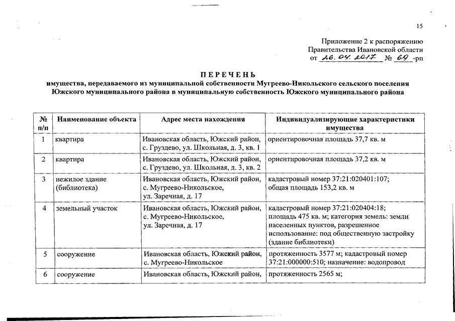 Распоряжение Правительства Ивановской области от 26.04.2017 N 69-рп "О разграничении имущества, находящегося в муниципальной собственности, между Южским муниципальным районом и сельскими поселениями, входящими в его состав, в связи с изменением перечня вопросов местного значения сельского поселения"