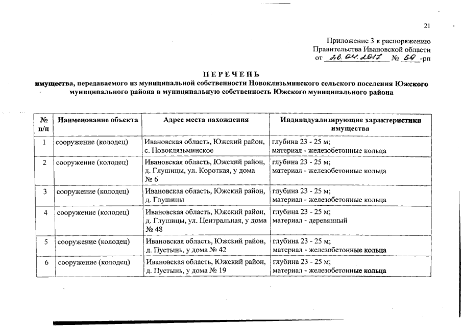 Распоряжение Правительства Ивановской области от 26.04.2017 N 69-рп "О разграничении имущества, находящегося в муниципальной собственности, между Южским муниципальным районом и сельскими поселениями, входящими в его состав, в связи с изменением перечня вопросов местного значения сельского поселения"