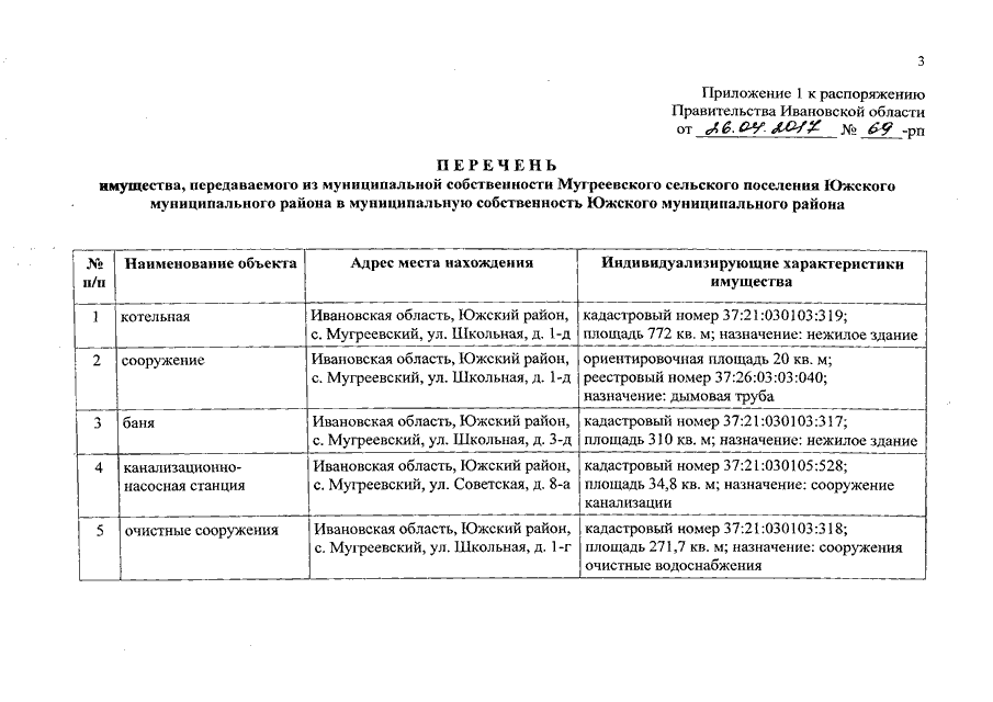 Распоряжение Правительства Ивановской области от 26.04.2017 N 69-рп "О разграничении имущества, находящегося в муниципальной собственности, между Южским муниципальным районом и сельскими поселениями, входящими в его состав, в связи с изменением перечня вопросов местного значения сельского поселения"