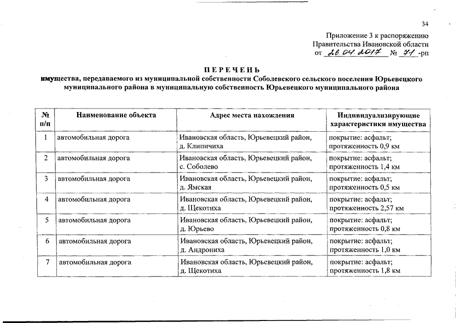 Распоряжение Правительства Ивановской области от 26.04.2017 N 71-рп "О разграничении имущества, находящегося в муниципальной собственности, между Юрьевецким муниципальным районом и сельскими поселениями, входящими в его состав, в связи с изменением перечня вопросов местного значения сельского поселения"