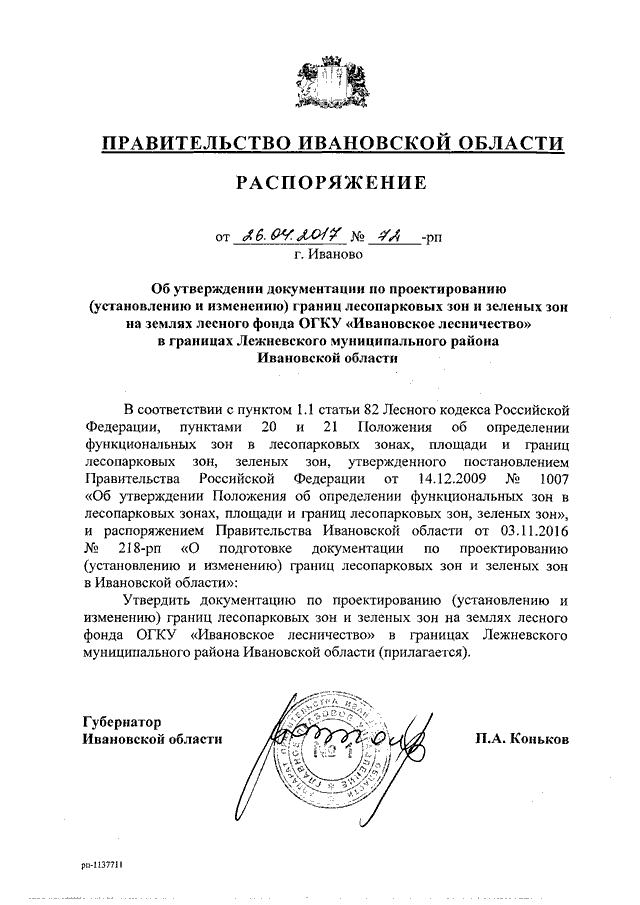 Распоряжение Правительства Ивановской области от 26.04.2017 N 72-рп "Об утверждении документации по проектированию (установлению и изменению) границ лесопарковых зон и зеленых зон на землях лесного фонда ОГКУ "Ивановское лесничество" в границах Лежневского муниципального района Ивановской области"