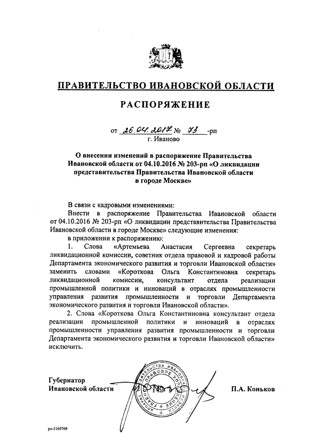 Распоряжение Правительства Ивановской области от 26.04.2017 N 73-рп "О внесении изменений в распоряжение Правительства Ивановской области от 04.10.2016 N 203-рп "О ликвидации представительства Правительства Ивановской области в городе Москве"