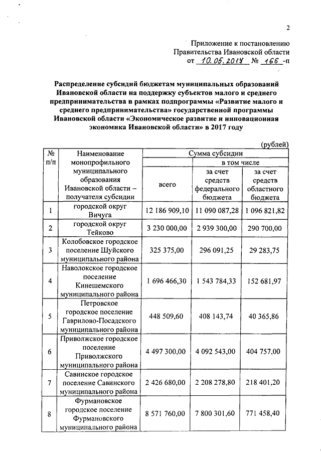 Постановление Правительства Ивановской области от 10.05.2017 N 166-п "О распределении субсидий бюджетам муниципальных образований Ивановской области на поддержку субъектов малого и среднего предпринимательства в рамках подпрограммы "Развитие малого и среднего предпринимательства" государственной программы Ивановской области "Экономическое развитие и инновационная экономика Ивановской области" в 2017 году"