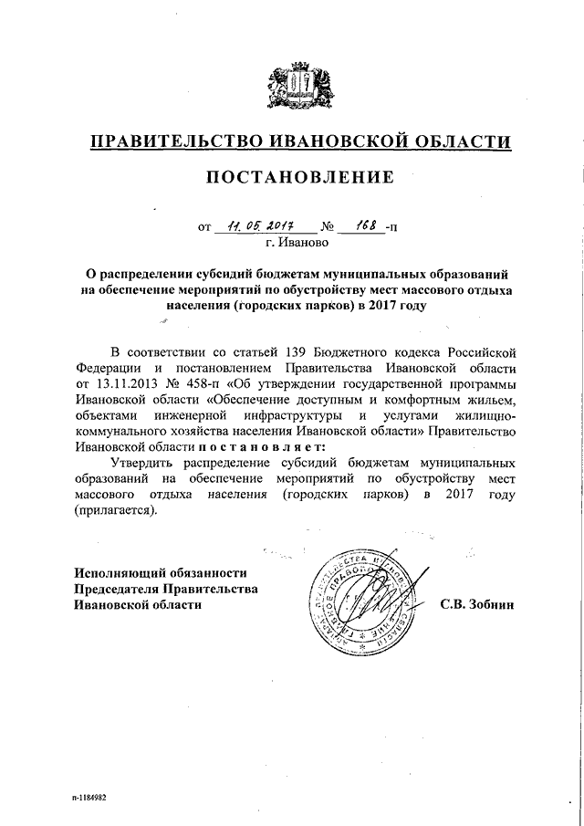 Постановление Правительства Ивановской области от 11.05.2017 N 168-п "О распределении субсидий бюджетам муниципальных образований на обеспечение мероприятий по обустройству мест массового отдыха населения (городских парков) в 2017 году"