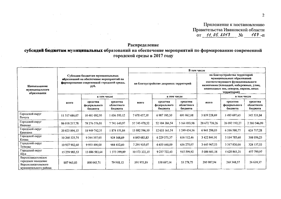 Постановление Правительства Ивановской области от 11.05.2017 N 167-п "О распределении субсидий бюджетам муниципальных образований на обеспечение мероприятий по формированию современной городской среды в 2017 году"