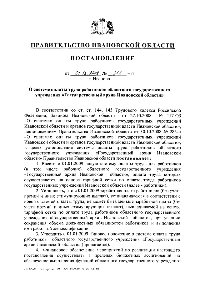 Постановление Правительства Ивановской области от 31.12.2008 N 363-п "О системе оплаты труда работников областного государственного учреждения "Государственный архив Ивановской области" (вместе с "Типовым положением о системе оплаты труда работников областного государственного учреждения "Государственный архив Ивановской области")
