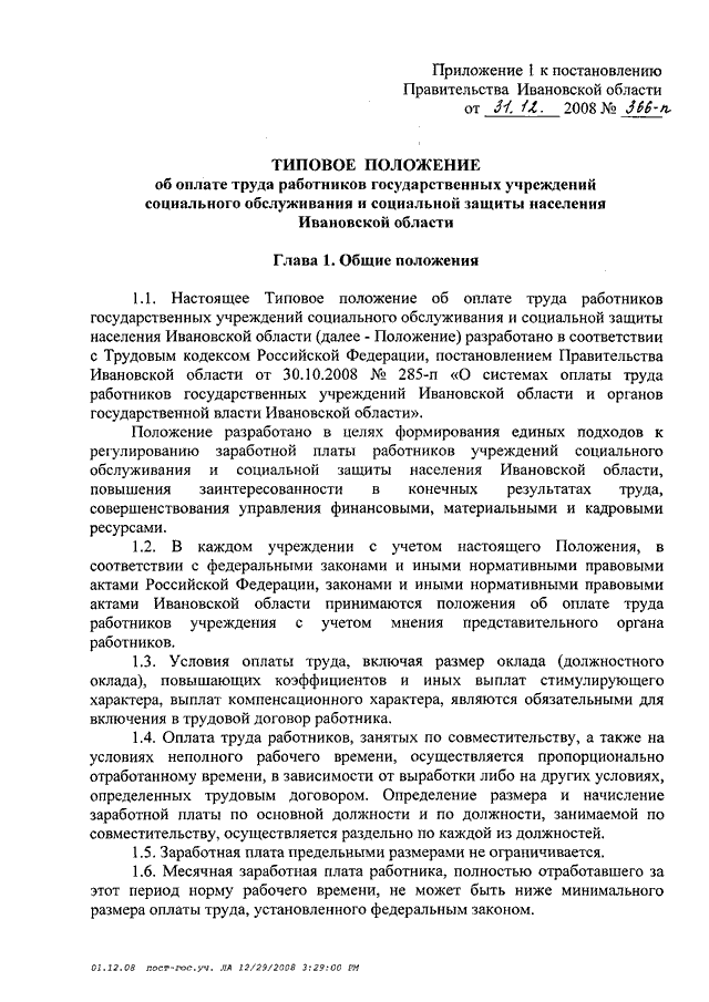 Постановление Правительства Ивановской области от 31.12.2008 N 366-п "О системе оплаты труда работников государственных учреждений системы социальной защиты населения Ивановской области" (вместе с "Типовым положением об оплате труда работников государственных учреждений социального обслуживания и социальной защиты населения Ивановской области", "Типовым положением об оплате труда работников государственных образовательных учреждений для детей-сирот и детей, оставшихся без попечения родителей, Ивановской области", "Перечнями должностей работников государственных учреждений системы социальной защиты населения Ивановской области, относимых к основному персоналу, для расчета средней заработной платы и определения размеров должностных окладов руководителей учреждений системы социальной защиты населения Ивановской области")
