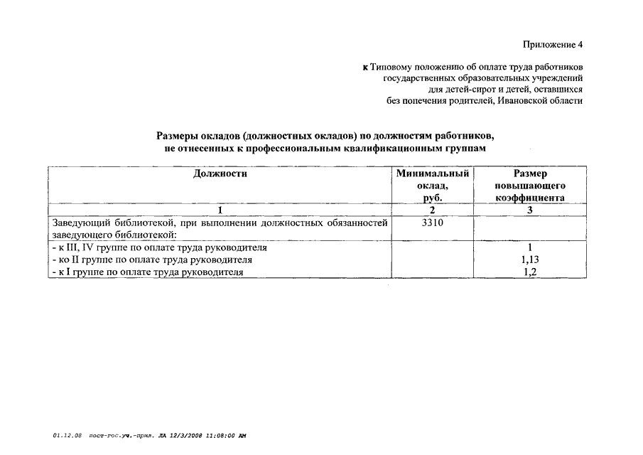 Постановление Правительства Ивановской области от 31.12.2008 N 366-п "О системе оплаты труда работников государственных учреждений системы социальной защиты населения Ивановской области" (вместе с "Типовым положением об оплате труда работников государственных учреждений социального обслуживания и социальной защиты населения Ивановской области", "Типовым положением об оплате труда работников государственных образовательных учреждений для детей-сирот и детей, оставшихся без попечения родителей, Ивановской области", "Перечнями должностей работников государственных учреждений системы социальной защиты населения Ивановской области, относимых к основному персоналу, для расчета средней заработной платы и определения размеров должностных окладов руководителей учреждений системы социальной защиты населения Ивановской области")