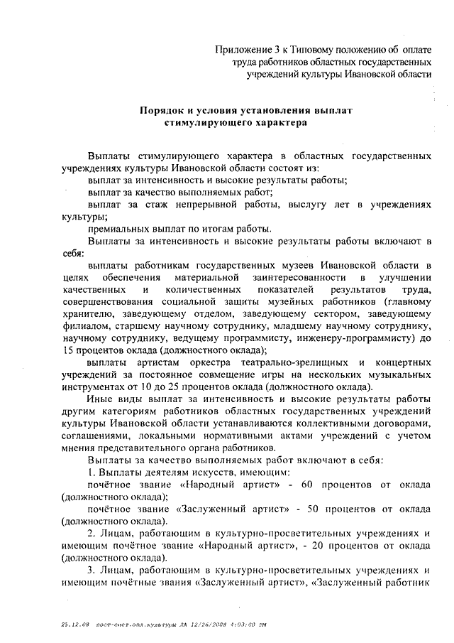 Постановление Правительства Ивановской области от 31.12.2008 N 367-п "О системе оплаты труда работников областных государственных учреждений, подведомственных Департаменту культуры и культурного наследия Ивановской области" (вместе с "Типовым положением об оплате труда работников областных государственных учреждений культуры Ивановской области", "Типовым положением об оплате труда работников областных государственных образовательных учреждений сферы культуры Ивановской области")