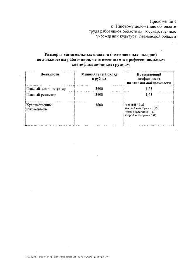Постановление Правительства Ивановской области от 31.12.2008 N 367-п "О системе оплаты труда работников областных государственных учреждений, подведомственных Департаменту культуры и культурного наследия Ивановской области" (вместе с "Типовым положением об оплате труда работников областных государственных учреждений культуры Ивановской области", "Типовым положением об оплате труда работников областных государственных образовательных учреждений сферы культуры Ивановской области")