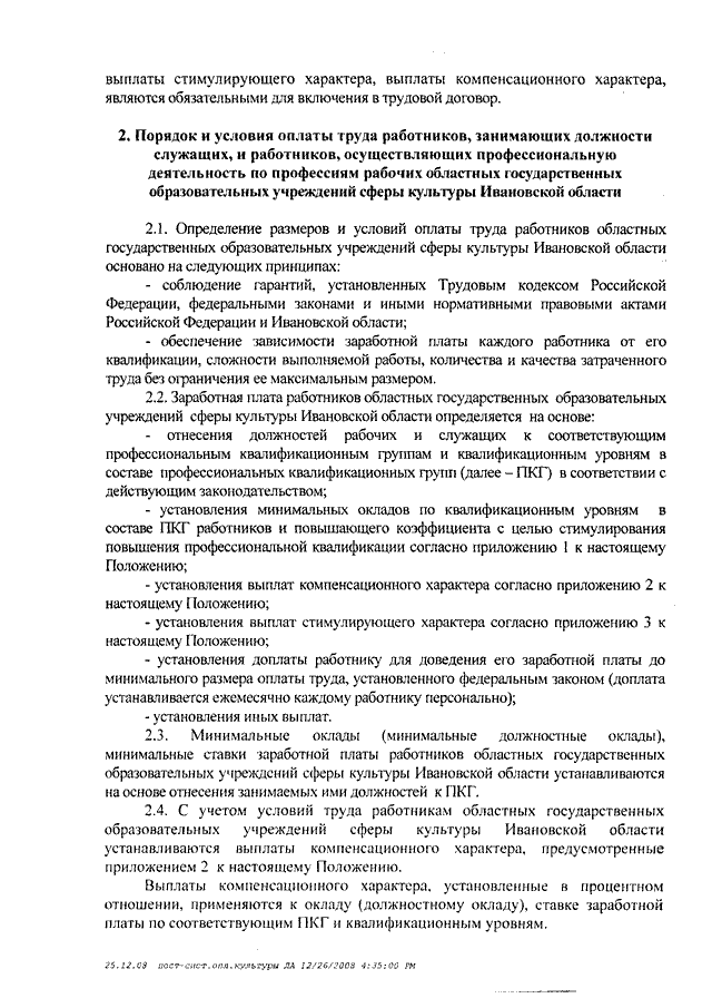 Постановление Правительства Ивановской области от 31.12.2008 N 367-п "О системе оплаты труда работников областных государственных учреждений, подведомственных Департаменту культуры и культурного наследия Ивановской области" (вместе с "Типовым положением об оплате труда работников областных государственных учреждений культуры Ивановской области", "Типовым положением об оплате труда работников областных государственных образовательных учреждений сферы культуры Ивановской области")