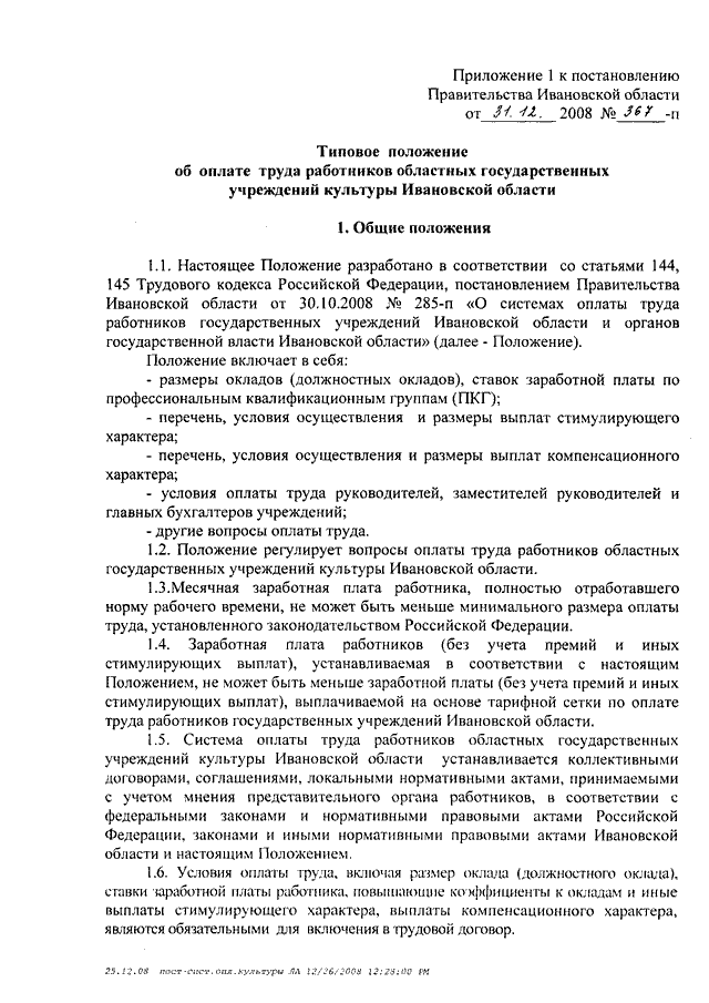 Постановление Правительства Ивановской области от 31.12.2008 N 367-п "О системе оплаты труда работников областных государственных учреждений, подведомственных Департаменту культуры и культурного наследия Ивановской области" (вместе с "Типовым положением об оплате труда работников областных государственных учреждений культуры Ивановской области", "Типовым положением об оплате труда работников областных государственных образовательных учреждений сферы культуры Ивановской области")