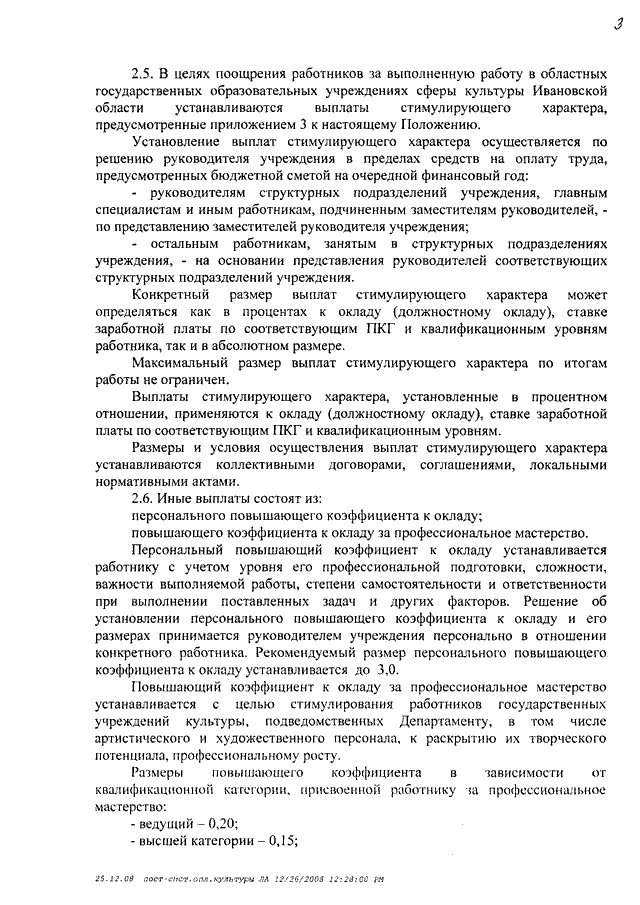 Постановление Правительства Ивановской области от 31.12.2008 N 367-п "О системе оплаты труда работников областных государственных учреждений, подведомственных Департаменту культуры и культурного наследия Ивановской области" (вместе с "Типовым положением об оплате труда работников областных государственных учреждений культуры Ивановской области", "Типовым положением об оплате труда работников областных государственных образовательных учреждений сферы культуры Ивановской области")