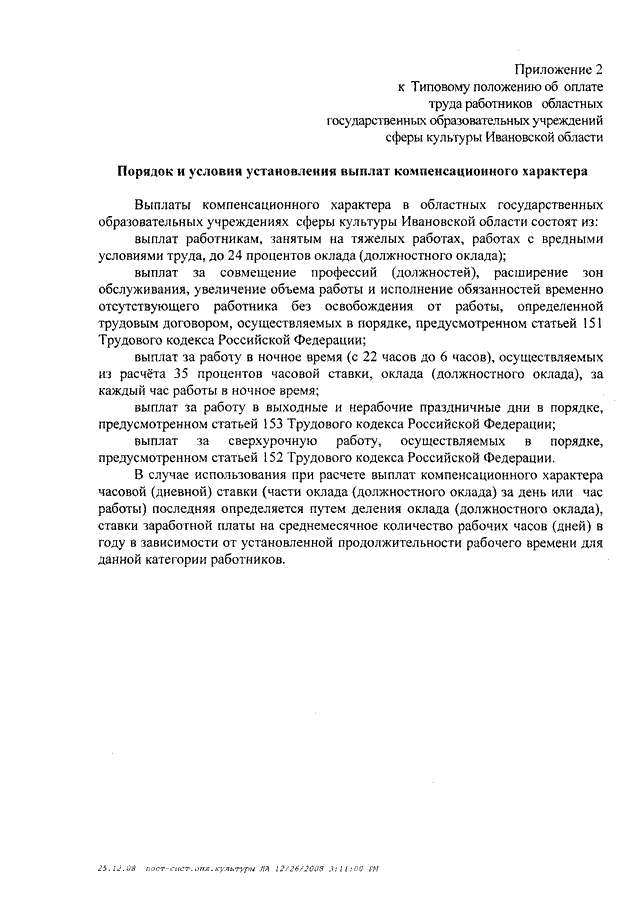 Постановление Правительства Ивановской области от 31.12.2008 N 367-п "О системе оплаты труда работников областных государственных учреждений, подведомственных Департаменту культуры и культурного наследия Ивановской области" (вместе с "Типовым положением об оплате труда работников областных государственных учреждений культуры Ивановской области", "Типовым положением об оплате труда работников областных государственных образовательных учреждений сферы культуры Ивановской области")