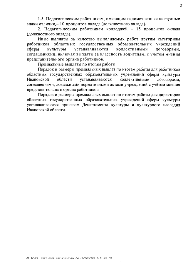 Постановление Правительства Ивановской области от 31.12.2008 N 367-п "О системе оплаты труда работников областных государственных учреждений, подведомственных Департаменту культуры и культурного наследия Ивановской области" (вместе с "Типовым положением об оплате труда работников областных государственных учреждений культуры Ивановской области", "Типовым положением об оплате труда работников областных государственных образовательных учреждений сферы культуры Ивановской области")