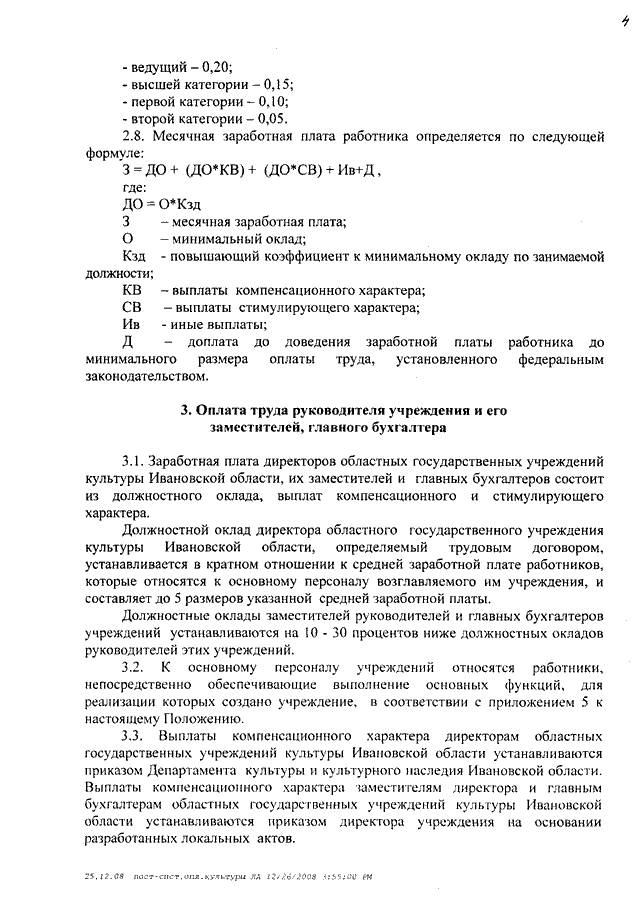 Постановление Правительства Ивановской области от 31.12.2008 N 367-п "О системе оплаты труда работников областных государственных учреждений, подведомственных Департаменту культуры и культурного наследия Ивановской области" (вместе с "Типовым положением об оплате труда работников областных государственных учреждений культуры Ивановской области", "Типовым положением об оплате труда работников областных государственных образовательных учреждений сферы культуры Ивановской области")