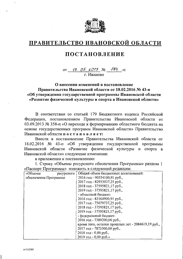 Постановление Правительства Ивановской области от 17.05.2017 N 174-п "О внесении изменений в постановление Правительства Ивановской области от 18.02.2016 N 43-п "Об утверждении государственной программы Ивановской области "Развитие физической культуры и спорта в Ивановской области"
