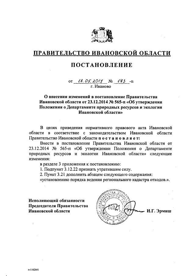 Постановление Правительства Ивановской области от 17.05.2017 N 173-п "О внесении изменений в постановление Правительства Ивановской области от 23.12.2014 N 565-п "Об утверждении Положения о Департаменте природных ресурсов и экологии Ивановской области"