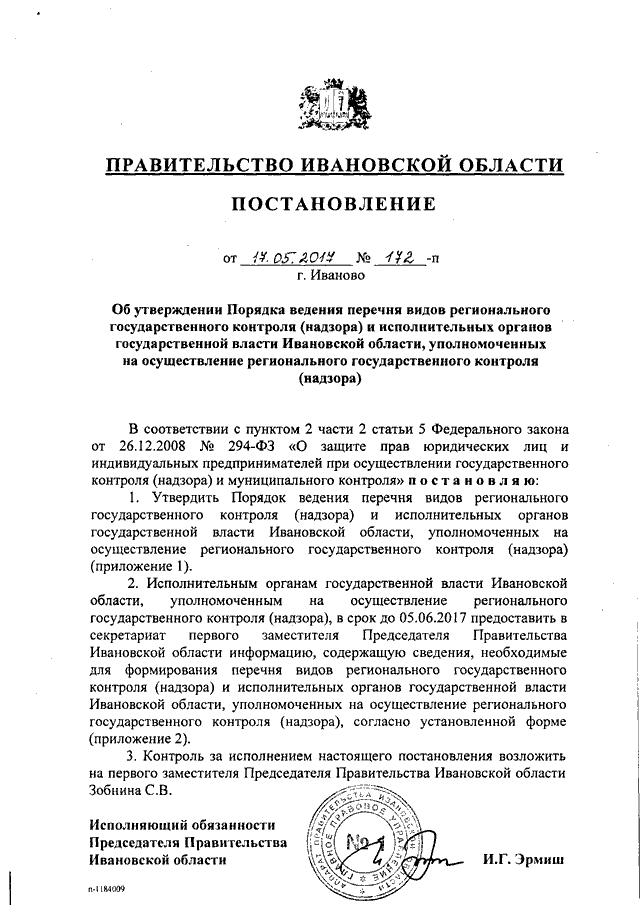 Постановление Правительства Ивановской области от 17.05.2017 N 172-п "Об утверждении Порядка ведения перечня видов регионального государственного контроля (надзора) и исполнительных органов государственной власти Ивановской области, уполномоченных на осуществление регионального государственного контроля (надзора)"