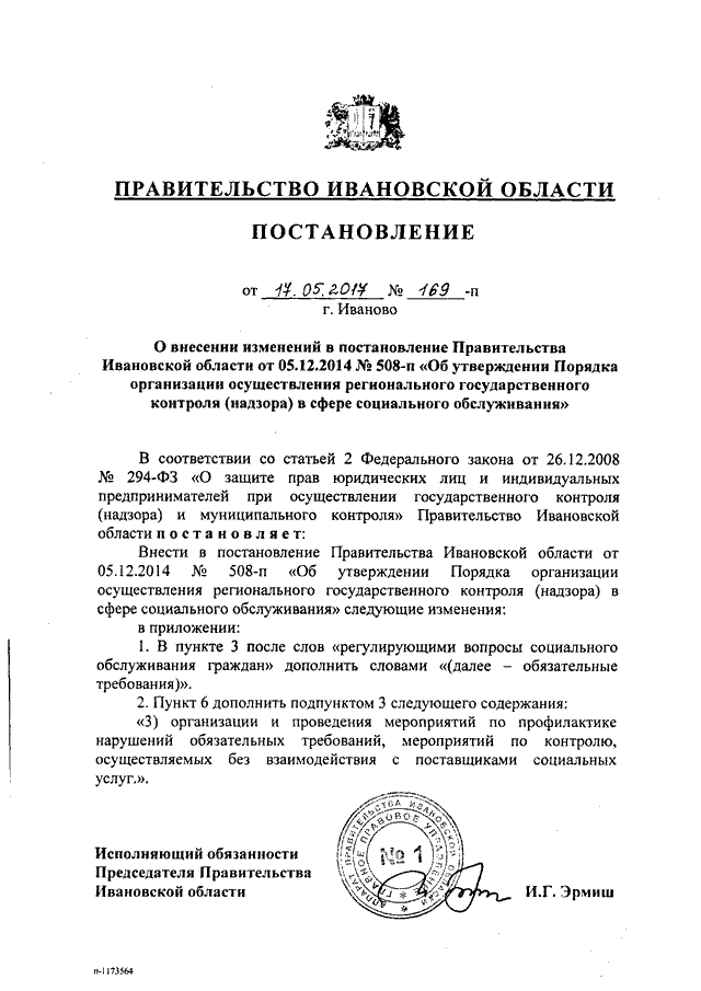 Постановление Правительства Ивановской области от 17.05.2017 N 169-п "О внесении изменений в постановление Правительства Ивановской области от 05.12.2014 N 508-п "Об утверждении Порядка организации осуществления регионального государственного контроля (надзора) в сфере социального обслуживания"