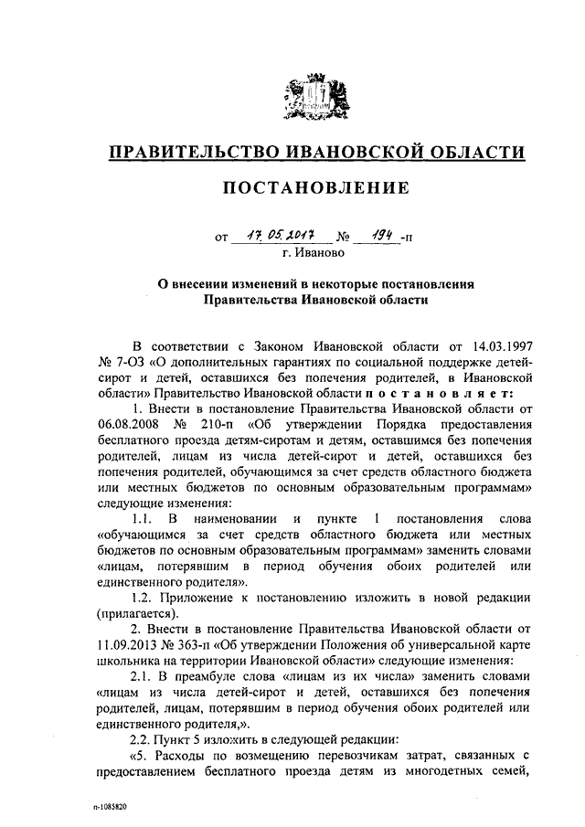 Постановление Правительства Ивановской области от 17.05.2017 N 194-п "О внесении изменений в некоторые постановления Правительства Ивановской области" (вместе с "Порядком предоставления бесплатного проезда детям-сиротам и детям, оставшимся без попечения родителей, лицам из числа детей-сирот и детей, оставшихся без попечения родителей, лицам, потерявшим в период обучения обоих родителей или единственного родителя")