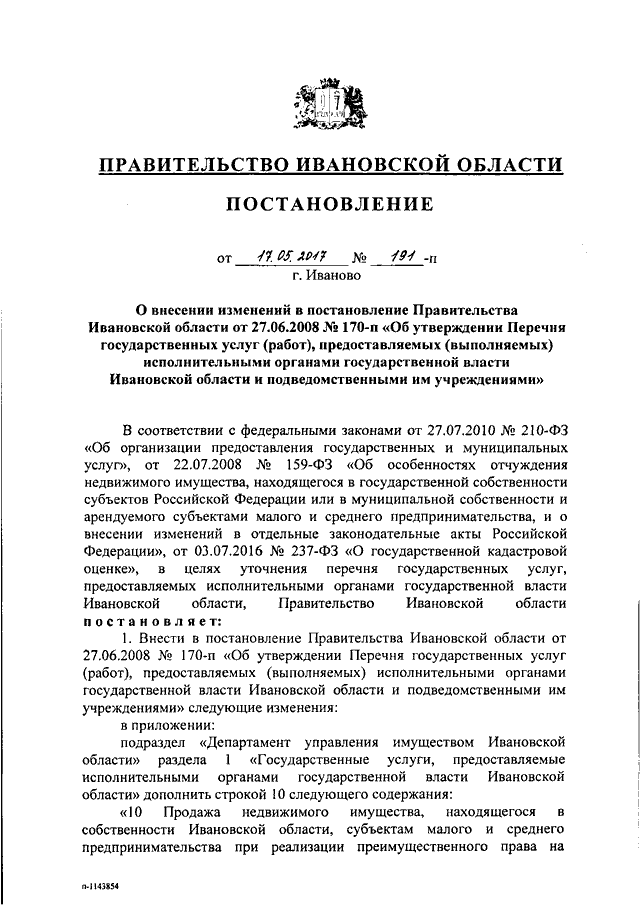 Постановление Правительства Ивановской области от 17.05.2017 N 191-п "О внесении изменений в постановление Правительства Ивановской области от 27.06.2008 N 170-п "Об утверждении Перечня государственных услуг (работ), предоставляемых (выполняемых) исполнительными органами государственной власти Ивановской области и подведомственными им учреждениями"