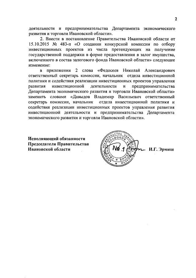 Постановление Правительства Ивановской области от 17.05.2017 N 190-п "О внесении изменений в постановления Правительства Ивановской области от 02.02.2011 N 15-п "О создании конкурсной комиссии по отбору инвестиционных проектов из числа претендующих на получение государственной поддержки в форме возмещения (субсидирования) за счет средств областного бюджета части затрат на уплату процентов по кредитам, привлекаемым на инвестиционные цели в российских кредитных организациях" и от 15.10.2015 N 483-п "О создании конкурсной комиссии по отбору инвестиционных проектов из числа претендующих на получение государственной поддержки в форме предоставления в залог имущества, включенного в состав залогового фонда Ивановской области"