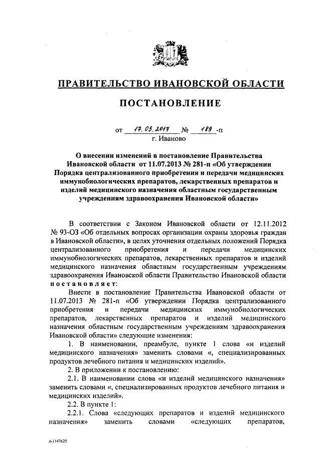 Постановление Правительства Ивановской области от 17.05.2017 N 189-п "О внесении изменений в постановление Правительства Ивановской области от 11.07.2013 N 281-п "Об утверждении Порядка централизованного приобретения и передачи медицинских иммунобиологических препаратов, лекарственных препаратов и изделий медицинского назначения областным государственным учреждениям здравоохранения Ивановской области"