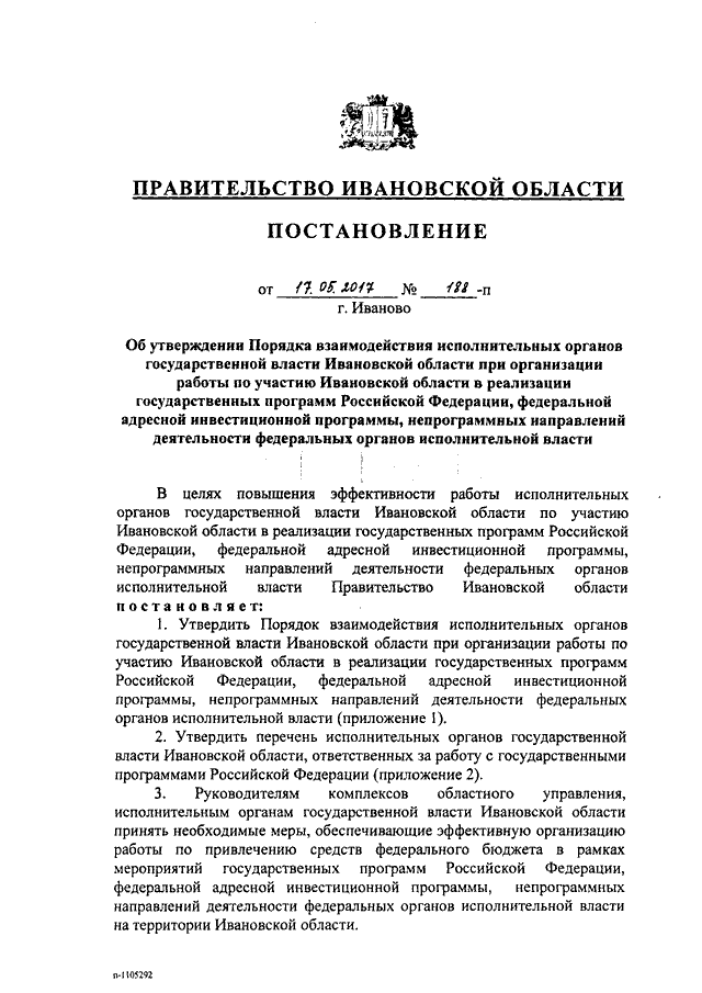 Постановление Правительства Ивановской области от 17.05.2017 N 188-п "Об утверждении Порядка взаимодействия исполнительных органов государственной власти Ивановской области при организации работы по участию Ивановской области в реализации государственных программ Российской Федерации, федеральной адресной инвестиционной программы, непрограммных направлений деятельности федеральных органов исполнительной власти" (вместе с "Перечнем исполнительных органов государственной власти Ивановской области, ответственных за работу с государственными программами Российской Федерации")
