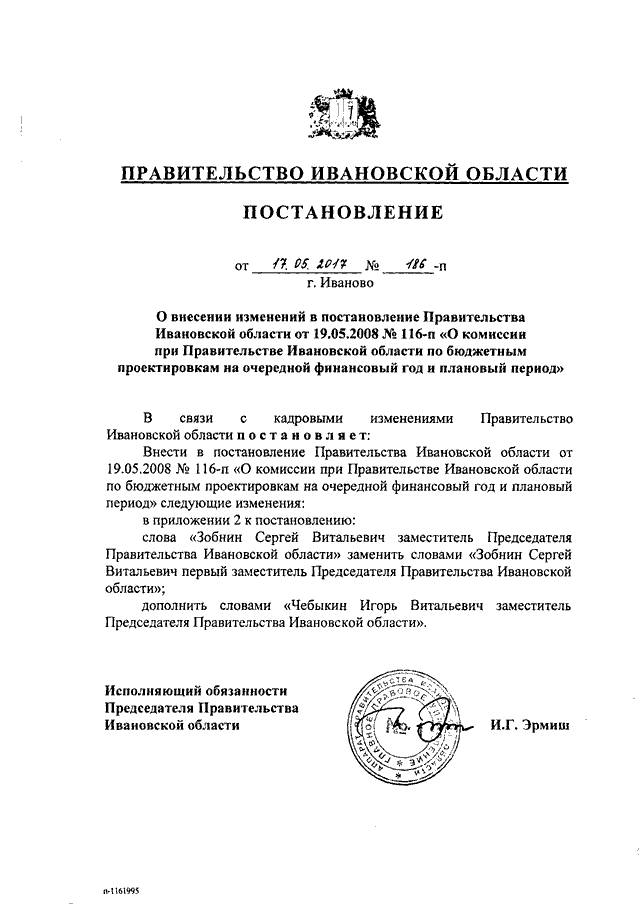 Постановление Правительства Ивановской области от 17.05.2017 N 186-п "О внесении изменений в постановление Правительства Ивановской области от 19.05.2008 N 116-п "О комиссии при Правительстве Ивановской области по бюджетным проектировкам на очередной финансовый год и плановый период"